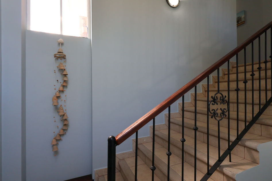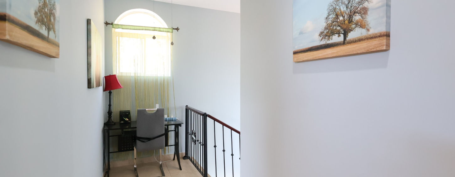 Upstairs, you’ll find two additional bedrooms, both with private bathrooms. The master bedroom includes a walk-in closet and direct access to a balcony with partial ocean views. This level also features a second office and a spacious terrace, ideal as a meditation lounge, reading area, or outdoor retreat.