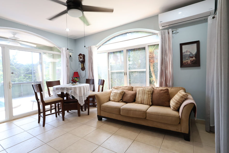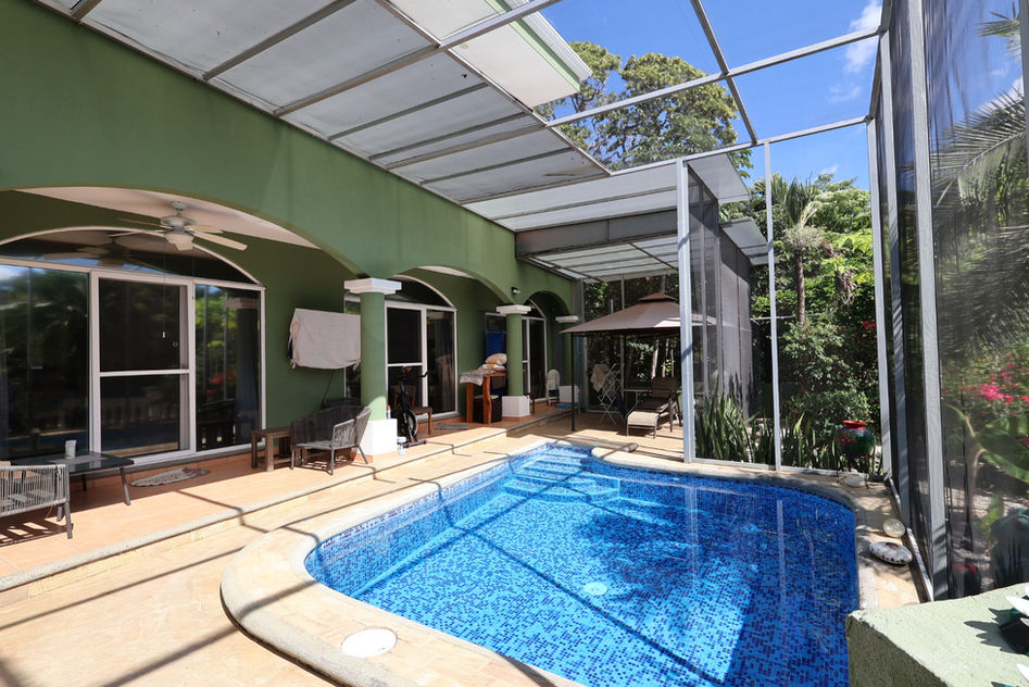 The living space opens onto a covered terrace with mosquito screens, creating a cozy, bug-free indoor outdoor environment. The terrace connects directly to a private swimming pool, surrounded by a lush, well-maintained garden that enhances privacy and comfort.